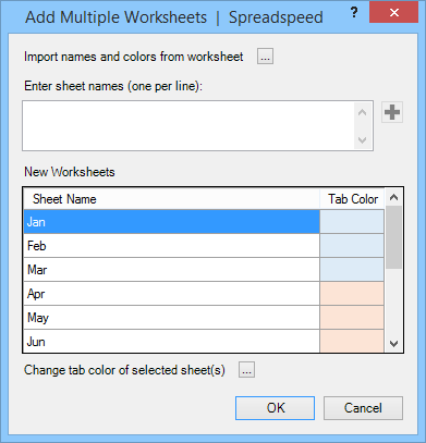 The Add Multiple Worksheets dialog allows you to either enter in a list of sheets names, or import the sheet names from the current worksheet. If you import the sheet names from the worksheet, you can set the fill color for each cell, and it will automatically be assigned as the tab color. You can customize the color of any selected sheet using the color dialog shown below-right. Once the sheet names and tab colors are set, clicking OK will add the new worksheets to the end of the workbook.